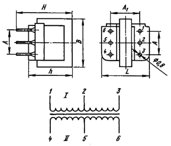 Расположение выводов трансформаторов подобно цоколевке электровакуумных приборов и реле. Имеется ключ и дополнительная маркировка первого вывода на боковой поверхности трансформатора (красная точка). Отсчет выводов производится по часовой стрелке со стороны монтажа. При этом первый вывод расположен в левом верхнем углу. Каркас трансформаторов получает дополнительную жесткость от армирования его жесткими выводами, расстояние между которыми равно шагу координатной сетки печатной платы.